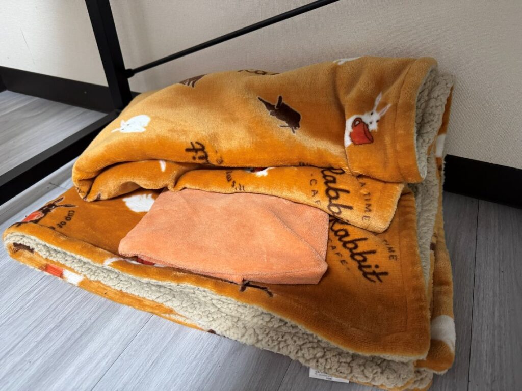 これに対抗するために、足元には大判サイズのブランケットを置いて、電子レンジで温めるタイプの湯たんぽを中に入れている。