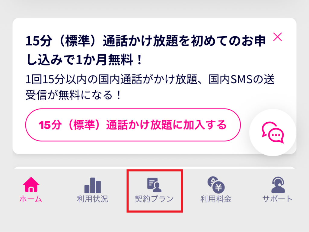 まずはアプリ「my 楽天モバイル」を開いて、下の「契約プラン」をタップ。