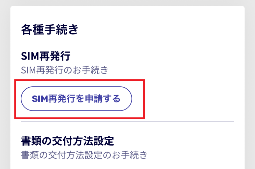 下にスクロールしていって、「各種手続き」から「SIM再発行を申請する」をタップ。