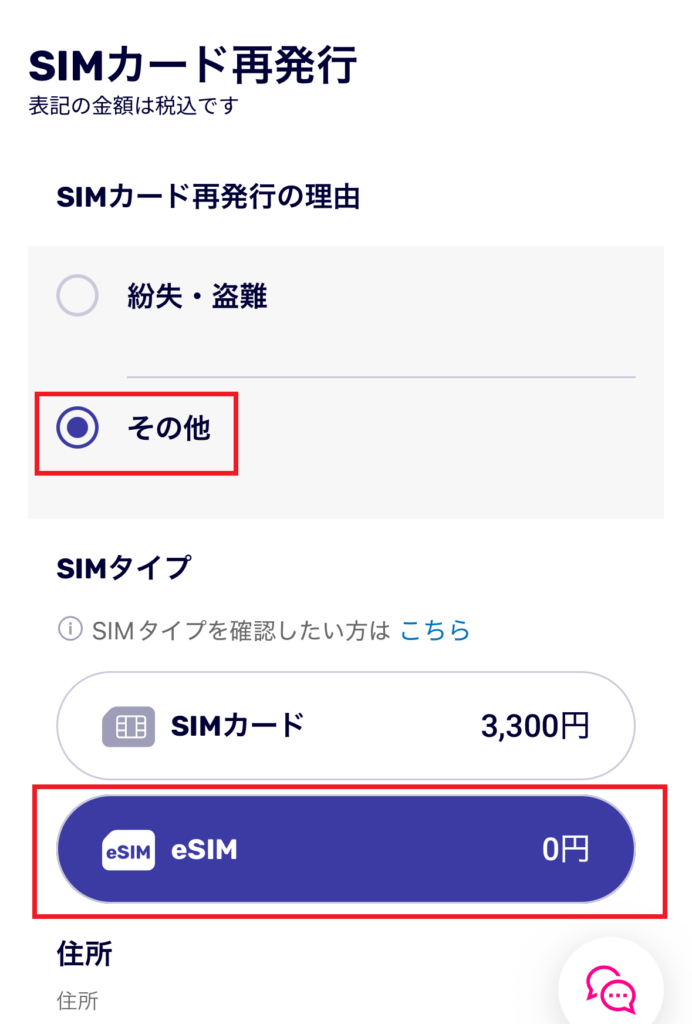 SIMカード再発行理由を「その他」にし、「eSIM」を選択。